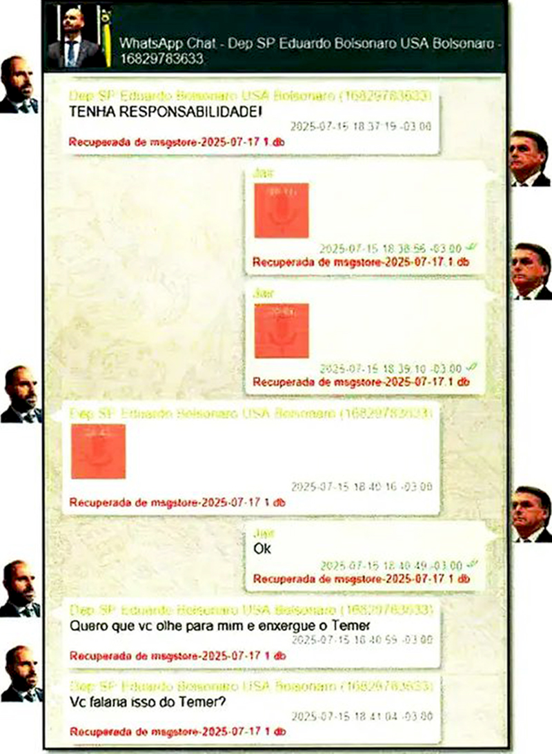 Os documentos, mensagens de texto e áudios trocados entre o ex-presidente Jair Bolsonaro e seu filho, o deputado Eduardo Bolsonaro (PL-SP), mostram um clima de tensão na família diante da crise que se instalou entre o Brasil e os Estados Unidos após o tarifaço de 50% imposto pelo presidente norte-americano Donald Trump.