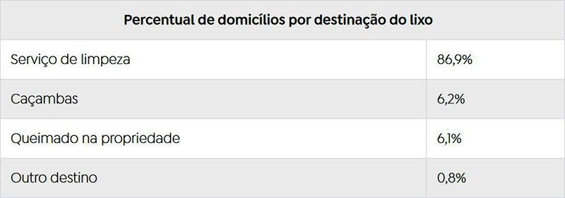 A pesquisa do IBGE mostra que 86,9% dos domicílios brasileiros contam com serviço de coleta de lixo.