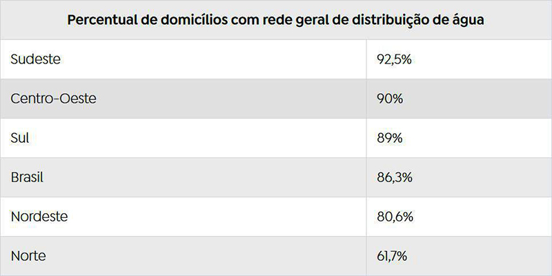 A Pnad analisou também a forma de os lares brasileiros receberem água. No país, 86,3% das residências têm rede geral de distribuição como principal forma de abastecimento. O Norte e Nordeste carregam os piores índices.