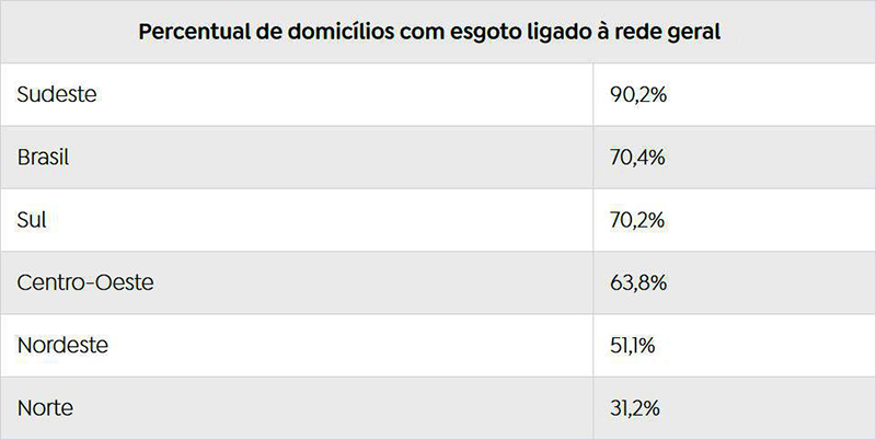 A Pnad aponta desigualdades regionais em relação ao tipo de esgotamento dos domicílios. A Região Sudeste supera a média nacional. As piores condições são localizadas no Nordeste e no Norte.