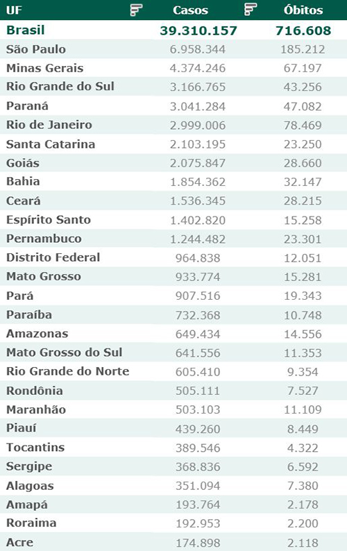 As secretarias estaduais de Saúde contabilizaram, desde o início da pandemia, em todo o país 39.310.157 diagnósticos positivos e 716.608 mortes em decorrência da Covid-19.