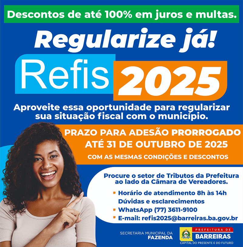 A Prefeitura de Barreiras, por meio da Secretaria da Fazenda, prorrogou até o dia 31 de outubro o prazo de adesão ao Programa Contribuinte Legal Barreiras 2025 – Refis, que oferece condições especiais para a regularização de dívidas tributárias e não tributárias com o município. A medida foi oficializada pelo Decreto nº 165, publicado no Diário Oficial do Município na última quinta-feira (4).