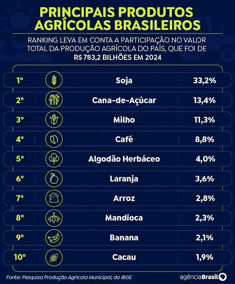 Apesar do recuo na soja, o país segue como maior produtor e maior exportador global da oleaginosa. A produção em 2024 ficou em 144,5 milhões de toneladas, com valor de R$ 260 bilhões.