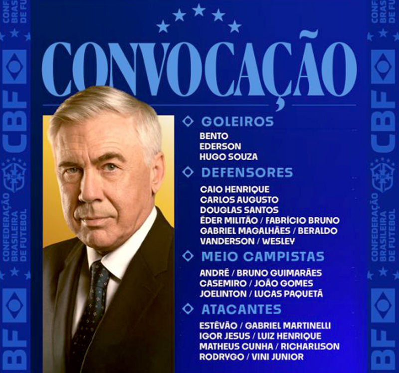 Vinicius Júnior não esteve presente na última convocação da seleção por opção de Ancelotti, que levou em conta o fato de o atacante ter que cumprir suspensão em uma das partidas. Já Rodrygo foi lembrado pela primeira vez por seu ex-comandante no Real Madrid (o italiano treinou os brasileiros na equipe espanhola na última temporada europeia).