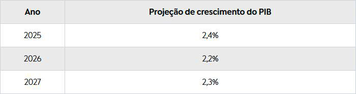 O Ministério da Fazenda tem projeções mais otimistas, com alta de 2,3% em 2025 e de 2,4% em 2026, de acordo com o Boletim MacroFiscal de setembro.
