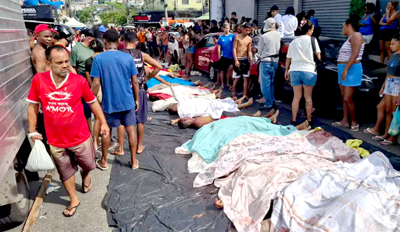 | Dezenas de corpos foram trazidos por moradores para a Praça São Lucas, na Penha, zona norte do Rio de Janeiro, após ação policial da Operação Contenção. Foto: Eusébio Gomes/TV Brasil |
