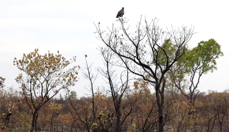 Gavião-caboclo em area de vegetação de cerrado atingida por queimada