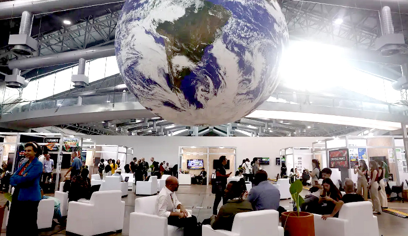 Globo terresta pendurado no teto de pavilhão da Blue Zone na COP 30 © Tânia Rêgo/Agência Brasil