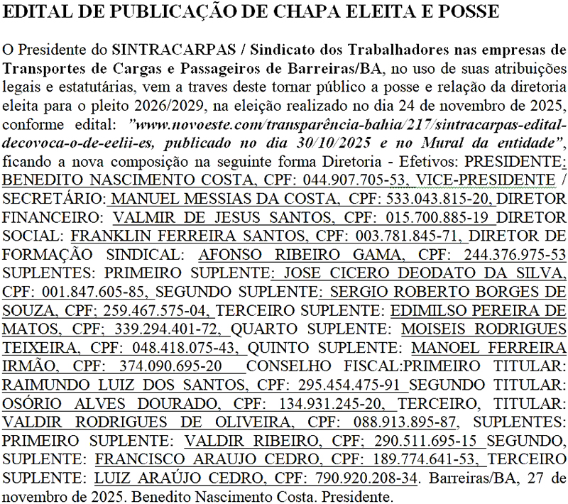SINTRACARPAS - EDITAL DE PUBLICAÇÃO DE CHAPA ELEITA E POSSE