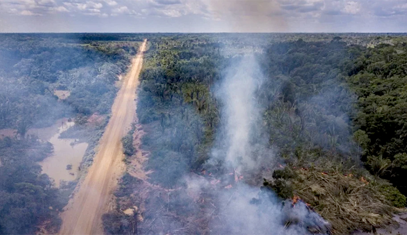 Vista aérea de desmatamento com fogo no Amazonas © Fernando Martinho/Repórter Brasil)
