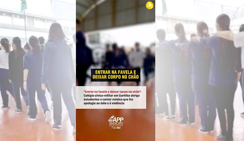 Associação dos Professores do Paraná (APP-Sindicato). Na gravação, adolescentes, sob orientação de um policial militar, aparecem marchando e entoando versos que falam em “
