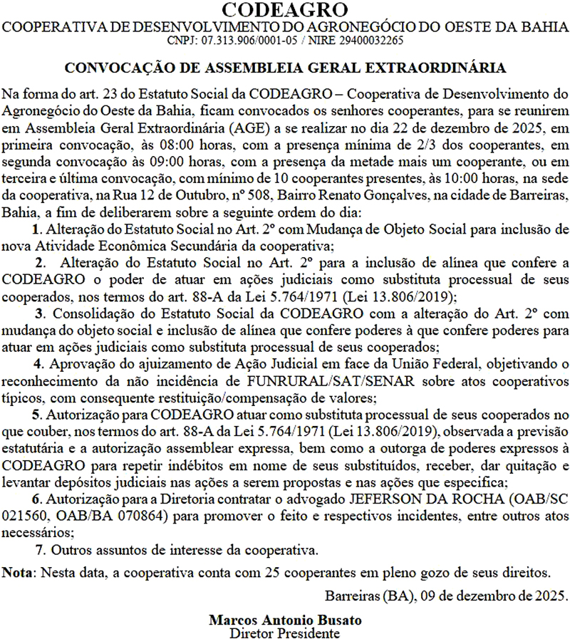 CODEAGRO - CONVOCAÇÃO DE ASSEMBLEIA GERAL EXTRAORDINÁRIA