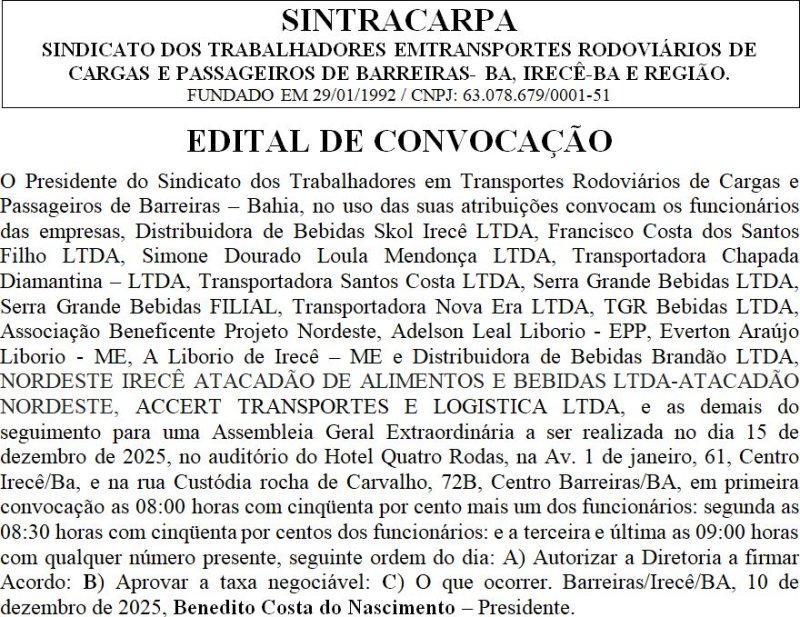 SINTRACARPAS - EDITAL DE CONVOCAÇÃO DE ASSEMBLEIA GERAL EXTRAORDINÁRIA