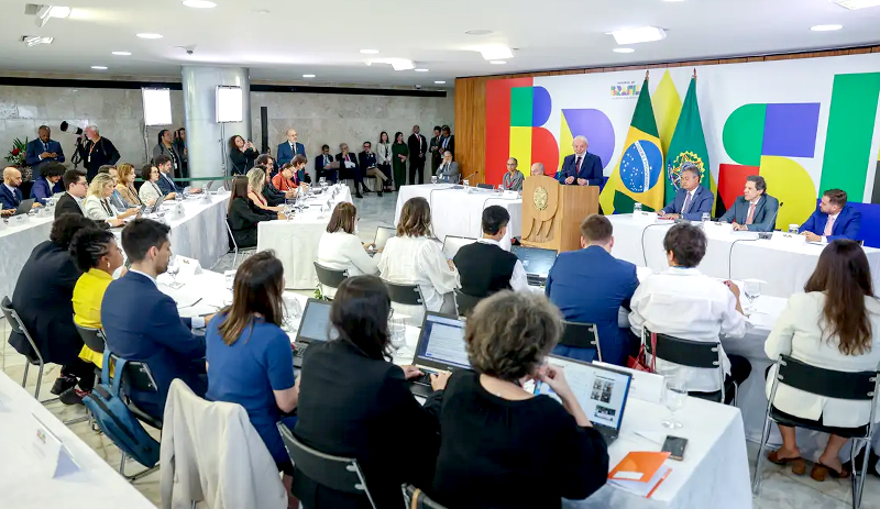 Na manhã desta quinta-feira, Lula recebeu jornalistas para um café da manhã, no Palácio do Planalto, seguido de coletiva de imprensa. Ele está acompanhado dos ministros da Fazenda, Fernando Haddad; da Casa Civil, Rui Costa; das Relações Exteriores, Mauro Vieira; e do Meio Ambiente e Mudança do Clima, Marina Silva.