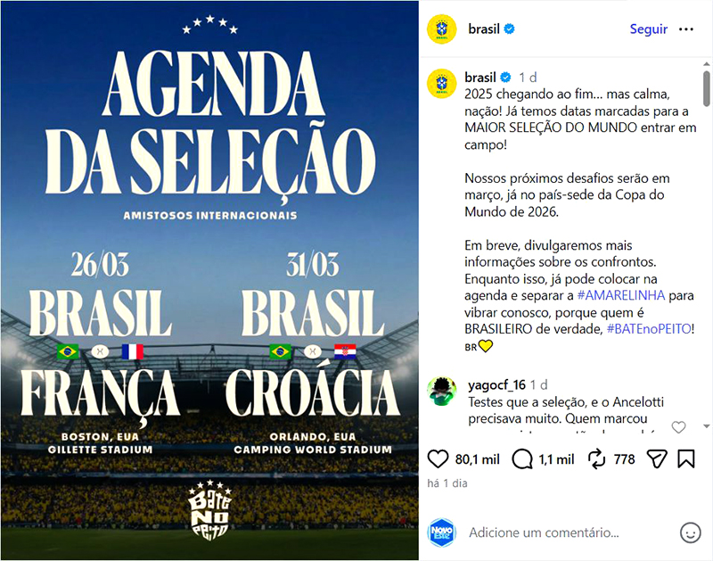 A Confederação Brasileira de Futebol (CBF) anunciou as datas dos amistosos da seleção brasileira contra a França e contra a Croácia. As partidas estão entre os últimos testes do Brasil antes do início da Copa do Mundo de 2026, que será realizada entre 11 de junho e 19 de julho no México, no Canadá e nos Estados Unidos.