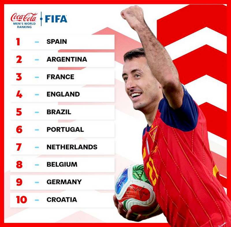 A 4ª colocada é a Inglaterra, enquanto Portugal (6ª), Holanda (7ª), Bélgica (8ª), Alemanha (9ª) e Croácia (10ª) completam o Top 10.