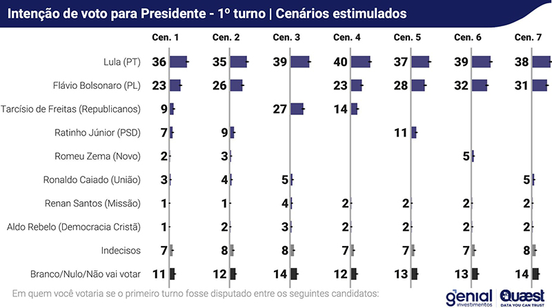 No primeiro turno, Lula aparece com 36%, Flávio Bolsonaro com 23% e Freitas com 9%, segundo a pesquisa.