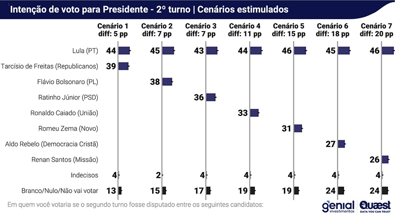 Lula também venceria o segundo turno das eleições presidenciais com 44% dos votos, contra 39% de Tarcísio de Freitas, segundo a pesquisa.