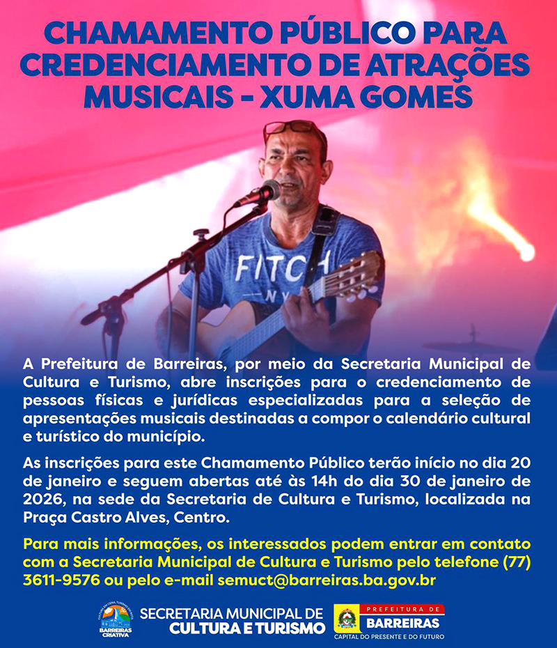 A Prefeitura de Barreiras, por meio da Secretaria Municipal de Cultura e Turismo, publicou no Diário Oficial do Município, edição nº 4579, na última segunda-feira (19), o Aviso de Chamamento Público nº 002/2026, denominado Xuma Gomes, que trata do credenciamento de pessoas físicas e jurídicas especializadas para a seleção de apresentações musicais destinadas a compor o calendário cultural e turístico do município.