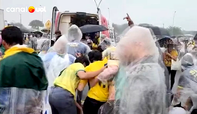 Durante um forte temporal que atingiu Brasília na tarde deste domingo (25), um raio caiu sobre um guindaste instalado pelos organizadores do ato na Praça do Cruzeiro e acabou atingindo pessoas que participavam do ato final convoado pelo deputado Nikolas Ferreira (PL-MG).