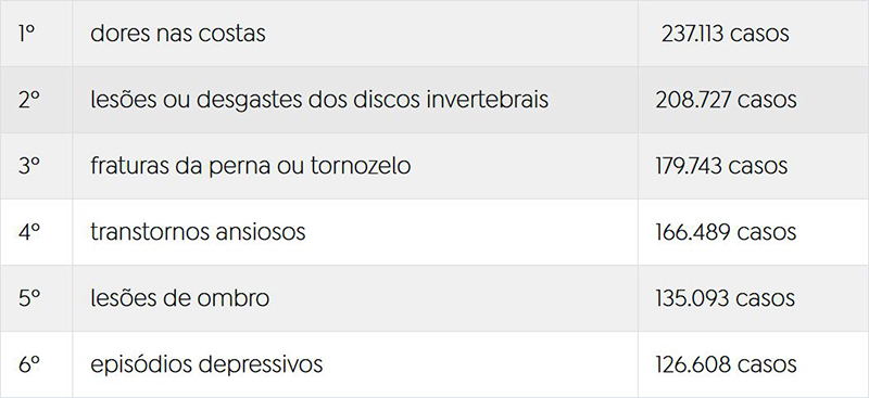 No caso das mulheres, em segundo lugar, aparecem os transtornos ansiosos (118.517), seguidos pelas lesões ou desgastes dos discos intervertebrais (98.305). Já no caso dos homens, em segundo fica a dorsalgia (115.527) e, em terceiro lugar, também as lesões ou desgastes dos discos intervertebrais (110.422), como as hérnias.