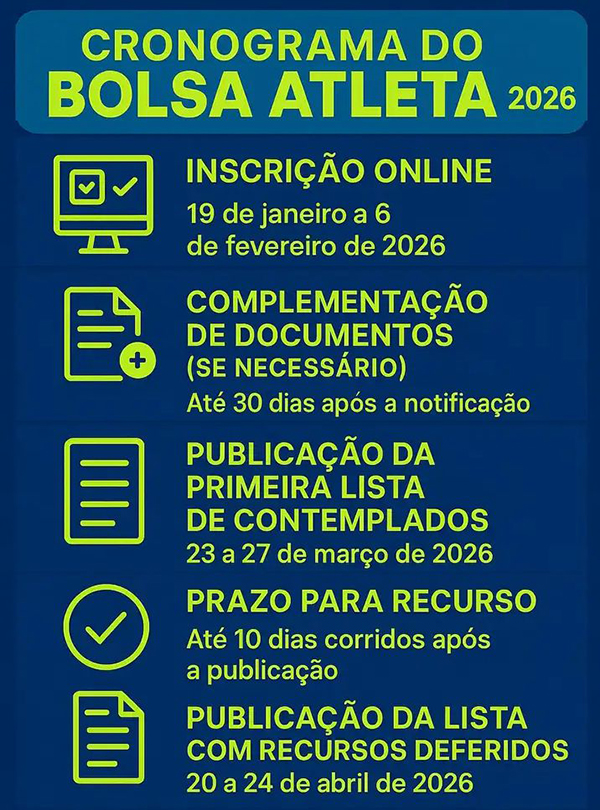 As inscrições para o programa Bolsa Atleta 2026 se encerram dia 6 de fevereiro. Interessados em acessar o benefício, que prevê pagamentos mensais pelo período de um ano a atletas de diversas categorias.